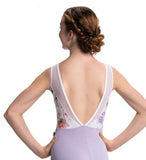 - This tank style features white mesh accents, waist seam and deep low V-back for added flair - a statement piece for class or audition.